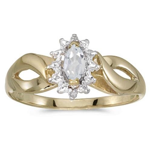 This 10k yellow gold April birthstone marquise white topaz and diamond ring features a 6x3 mm genuine natural white topaz with a 0.30 ct. colored stone weight and two diamond accents, 0.02 cttw. Birthstone jewelry always makes a perfect gift. Combine our April white topaz birthstone rings with matching earrings and a pendant for a pretty matching set. All ladies birthstone rings are available in one size, which varies between size 6 and 7. Men's birthstone rings are available in a size 10. Get a great look for a small price with these birthstone jewelry pieces made in the USA..