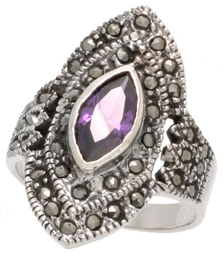 ※ Save Sterling Silver Marcasite Diamond-shaped Ring, w/ Marquise Cut Amethyst CZ, 1" (25mm) wide, size 7