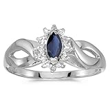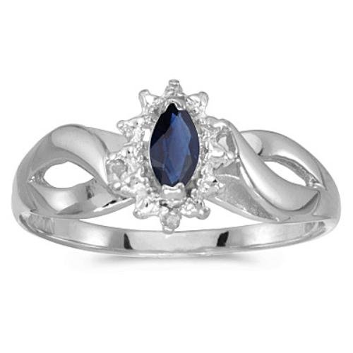 This 14k white gold September birthstone marquise sapphire and diamond ring features a 6x3 mm genuine natural sapphire with a 0.35 ct. colored stone weight and two diamond accents, 0.02 cttw. Birthstone jewelry always makes a perfect gift. Combine our September sapphire birthstone rings with matching earrings and a pendant for a pretty matching set. All ladies birthstone rings are available in one size, which varies between size 6 and 7. Men's birthstone rings are available in a size 10. Get a great look for a small price with these birthstone jewelry pieces made in the USA..
