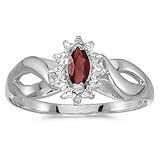 This 10k white gold January birthstone marquise garnet and diamond ring features a 6x3 mm genuine natural garnet with a 0.25 ct. colored stone weight and two diamond accents, 0.02 cttw. Birthstone jewelry always makes a perfect gift. Combine our January garnet birthstone rings with matching earrings and a pendant for a pretty matching set. All ladies birthstone rings are available in one size, which varies between size 6 and 7. Men's birthstone rings are available in a size 10. Get a great look for a small price with these birthstone jewelry pieces made in the USA..
