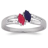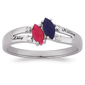 Personalized Valentines Day Gift. It takes two to create this ring! The hand-polished Sterling Silver ring is personalized with two engraved names, up to 10 letters each, and two stunning marquise-cut genuine gemstone birthstones. Twin Diamond accents represent the spark that keeps your passion alive. Available in full sizes, 5 thru 12.