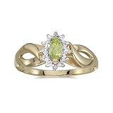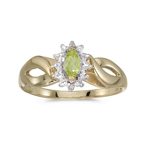 This 10k yellow gold marquise peridot and diamond ring features a 6x3 mm genuine natural peridot with a 0.25 ct total weight.