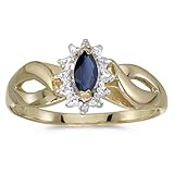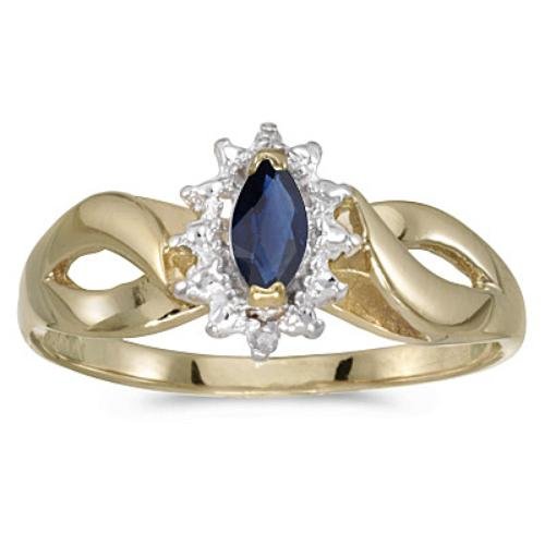 This 14k yellow gold September birthstone marquise sapphire and diamond ring features a 6x3 mm genuine natural sapphire with a 0.35 ct. colored stone weight and two diamond accents, 0.02 cttw. Birthstone jewelry always makes a perfect gift. Combine our September sapphire birthstone rings with matching earrings and a pendant for a pretty matching set. All ladies birthstone rings are available in one size, which varies between size 6 and 7. Men's birthstone rings are available in a size 10. Get a great look for a small price with these birthstone jewelry pieces made in the USA..