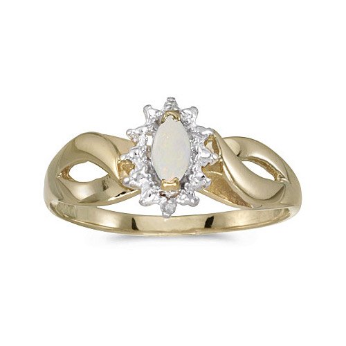 This 10k yellow gold marquise opal and diamond ring features a 6x3 mm genuine natural opal with a 0.17 ct total weight.