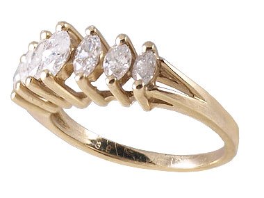 This fine ring is made of 14k yellow gold and set with 7 marquise cut white diamonds. Total weight of the stones is 0.96ct, the stones are securely set in prongs. Interesting design and decent diamond weight make this item a great present! Weight of this item is 2.8gr.